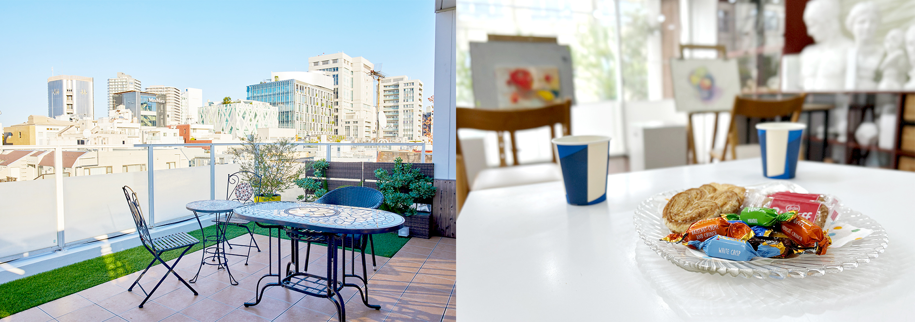 レッスン中は常に絵に向かわなくてはいけないということはありません。アトリエにある画集を見たり、お菓子を食べたりして、休憩を挟みながらゆったりとご自身のペースで制作していただけます。表参道を一望できる眺めのよいテラスは休憩にオススメの場所です。